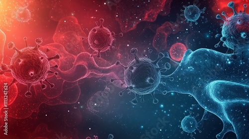 Stylized viral attack scene within a cellular microcosm, dynamic background gradient shifting from red to dark blue, viruses emitting a soft glow as they breach cell walls,
