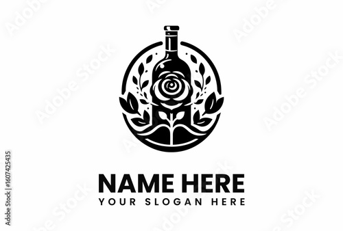 Stylized Wine Bottle Silhouette with Rose and Leaves in Circular Frame.