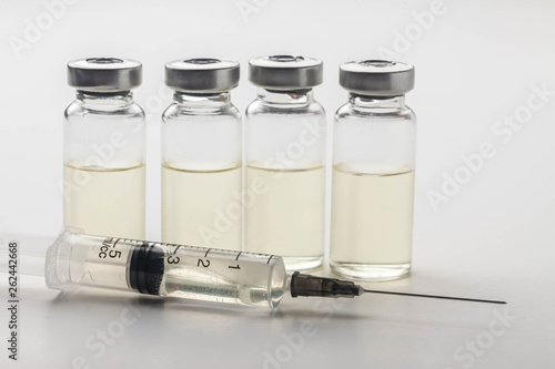 Subcutaneous syringe. Syringes with blue needles. Medical Injectors. Medical glass injection bottle. Ampoules with injections.