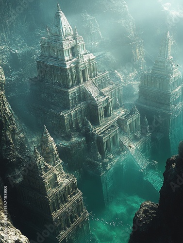 Submerged, ancient temple complex in deep ocean. Light rays filter down