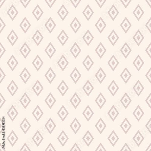 Subtle diamonds pattern. Vector geometric seamless texture with small rhombus shapes, grid, net. Abstract light pink and white graphic ornament. Delicate minimal background. Repeat decorative design