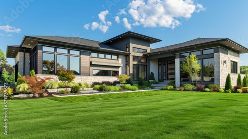 suburban home with a contemporary design, featuring an expansive front lawn that is meticulously landscaped to enhance the property's curb appeal