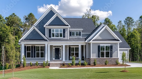 Suburban Home With Blue And Gray Exterior In A Lush Setting.