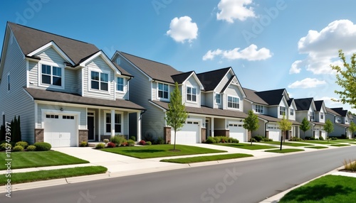 Suburban houses in row with manicured lawns. Modern homes with gray siding, dark roofs. Front yards small trees, shrubs. Sunny day in residential neighborhood. Springtime in North America. Houses new