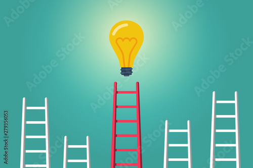 Success ladder to idea. Bright light bulb. Best choice. Competition concept. Vector illustration flat design. Isolated on background. Creative motivational landing page.
