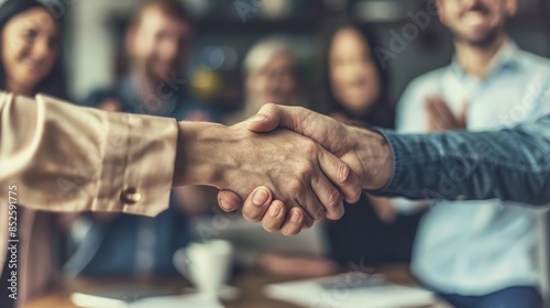 Successful Business Partners Celebrating Deal Closure with Team Applauding in Background