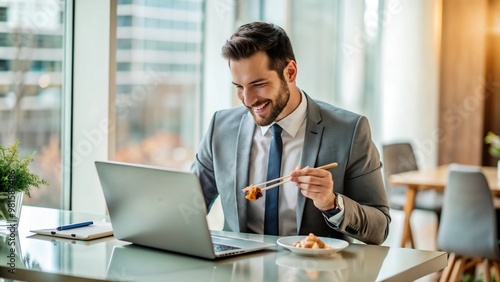 Successful businessman enjoying lunch while smiling and working on laptop in a modern office
