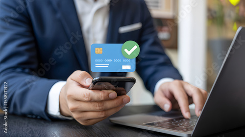 Successful online transaction displayed with a card icon and check mark on a mobile device while using a laptop for seamless business.