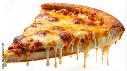 Succulent, golden-brown hot pizza slice with oozing, stringy melted cheese, perfectly isolated on a crisp white background, evoking instant hunger.