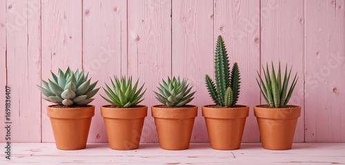 Succulents in terracotta pots are lined against a soft pink wooden background, creating a harmonious blend of natural and pastel tones.