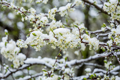 Sudden snowfall covering cherry tree blossoms with snow and ice in springtime in May, Northern Europe. Climate change concept.
