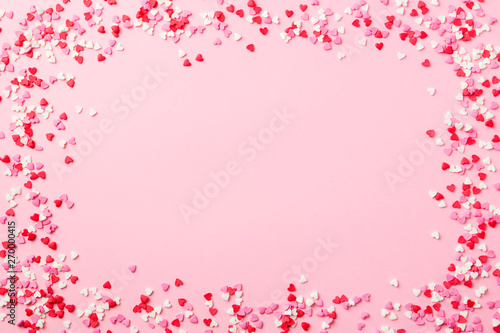 Sugar hearts frame on pink background. Romantic, St Valentines day concept. Top view. Copy space.