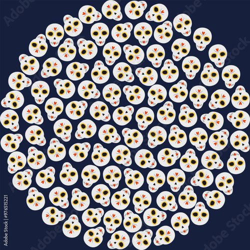 Sugar skulls with decorative hearts and lines. Circle background texture on dark blue Backdrop idea