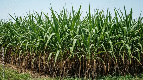 Sugarcane field with dense green foliage and exposed roots under blue sky on a sunny day in agricultural landscape