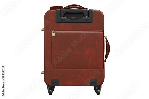 Suitcase leather with long handle, back view. 3D isolated white background