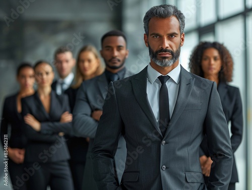 Suited man stands before business group