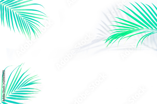 Summer and Spring tropical palm leaves on white background with a blank space for text, stylized image. Travel vacation concept. Summer background. Road frame set. Flat lay, top view.
