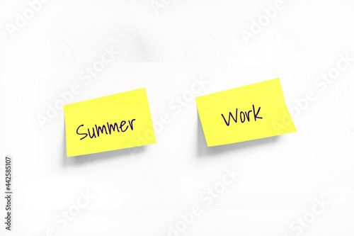 Summer and Work Handwriting text on two Yellow stickers on white Whatman paper. Concept of learning, work, programming, testing, business. Handwriting text, copy space