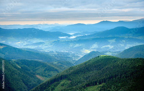 Summer background of the mountains. Breathtaking summer day in wild mountains with coniferous forest and green slopes. Scenic view of the morning mountains. Carpathian vivid landscapes.