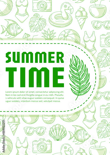 Summer beach vertical poster a4, vector green modern minimalist design with seasonal line icons pattern, space for text. For banner, book cover, notebook, card, invitation, advertising or planner