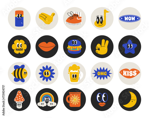 Summer character chat in retro groovy mood. Bundle patch and pack with cool quote slogan. Hippie vector labels in trendy color 90s