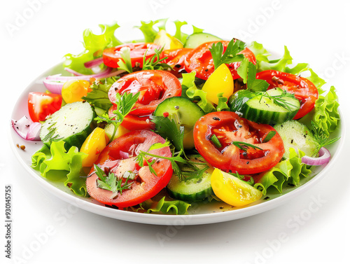 Summer colourful and full of vitamins vegetable salad . on a plate, close-up on a white background. AI generative.