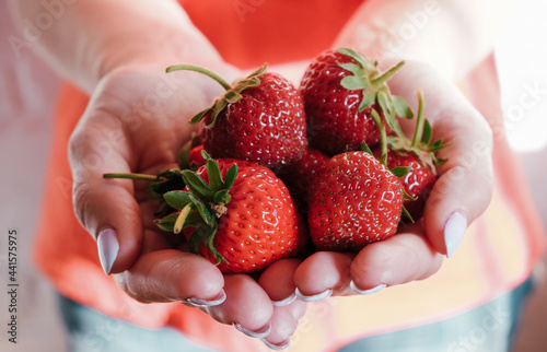 Summer concept. A girl in a red T-shirt holds ripe red strawberries in her palms. Photo with shadows in the rays of the sunset. Focus on fresh berries.