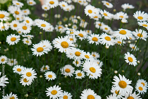 Summer concept. Crop view of the blooming daisies field in spring. selective soft focus. much Chamomile, top view. outdoor rural horizontal background