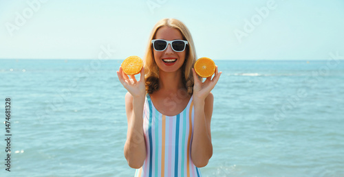 Summer, happy smiling young woman, laughing, with fruits, having fun on the beach on sea background