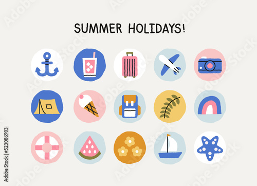Summer holidays. Set of stickers with symbols of tourism and vacation. Cute style, pastel colors. Icons, highlights. Hand drawn vector illustration. For print, fabric and wrapping paper design.