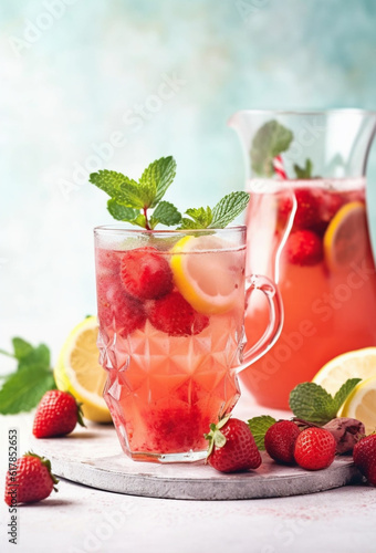 Summer strawberry lemonade on light background. Strawberry mojito with berries and mint. Strawberry smoothie with berries. Generative AI