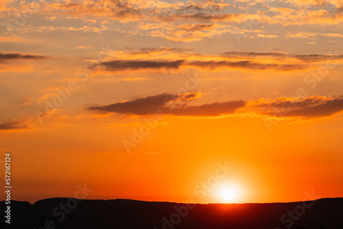 Summer sunset with yellow and orange colours. Beautiful clouds in the sky. The sun hovers over the mountain. The sun's rays from below illuminate the dark clouds. The beauty of nature.