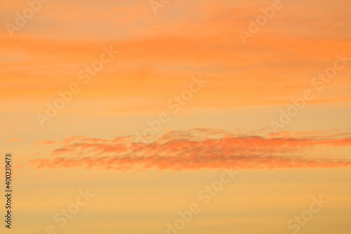 Sun below the horizon and clouds in the fiery dramatic orange sky at sunset or dawn backlit by the sun. Place for text and design