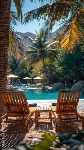 Sun lounger in a hotel near the pool, under the shade of palm trees in Oman