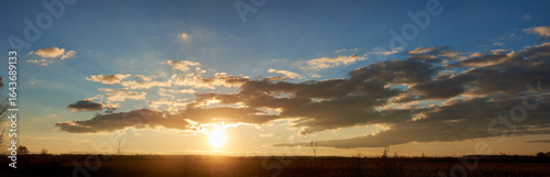 Sun sets low on horizon, casting golden glow across landscape. Fluffy clouds, illuminated with warm hues, float against clear blue sky. Serene scene tranquil, with last light of day fading gently.