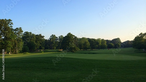 Sun setting over a golf course fairway and green