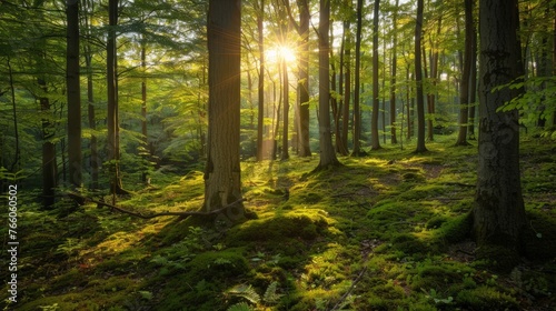 Sun shines through light spruce forest, soil overgrown with moss and fern, mountain range Deister,