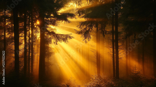 Sun shines through trees in foggy forest 3d render illustration. 3D Illustration
