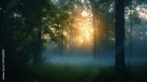 Sun shining through forest trees with foggy dawn atmosphere, A silent forest at dawn with a carpet of fog over the underbrush, AI Generated