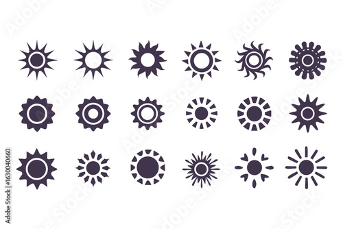 Sun silhouette icon set. Collection of simple vector sun shapes and graphic elements isolated on a white background.