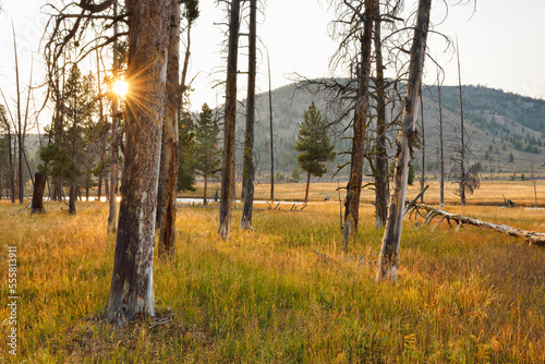 Sun through Trees in Forest in Autumn, Yellowstone National Park, Wyoming, USA