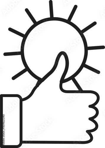 Sun with thumbs up icon representing warm weather or good climate conditions for weather forecast apps with transparent background