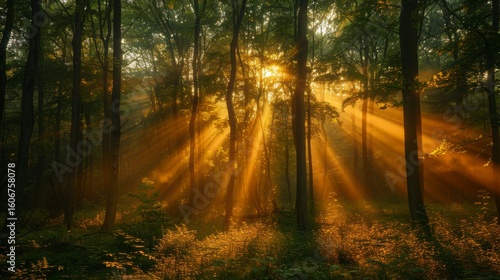 Sunbeams burst through lush, green forest trees, creating a warm, ethereal atmosphere
