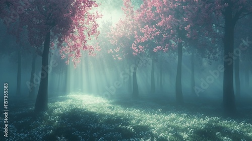 Sunbeams illuminate a mystical pink blossom forest path.
