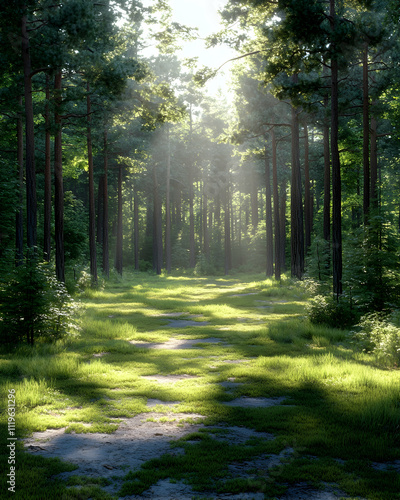 Sunbeams illuminate a path through a lush green forest. (1)