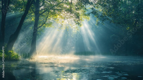 Sunbeams illuminate a tranquil forest scene with a calm river reflecting the light, creating a mystical and serene atmosphere.