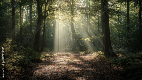 Sunbeams illuminate mystical forest path green trees nature ray calm dark woods light scenic summer