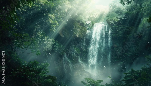 Sunbeams Illuminating a Lush Waterfall in a Dense Rainforest