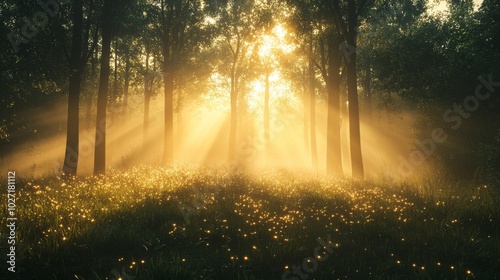 Sunbeams Illuminating a Misty Forest Clearing with Glowing Lights