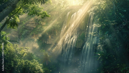 Sunbeams Illuminating a Waterfall in a Lush Rainforest